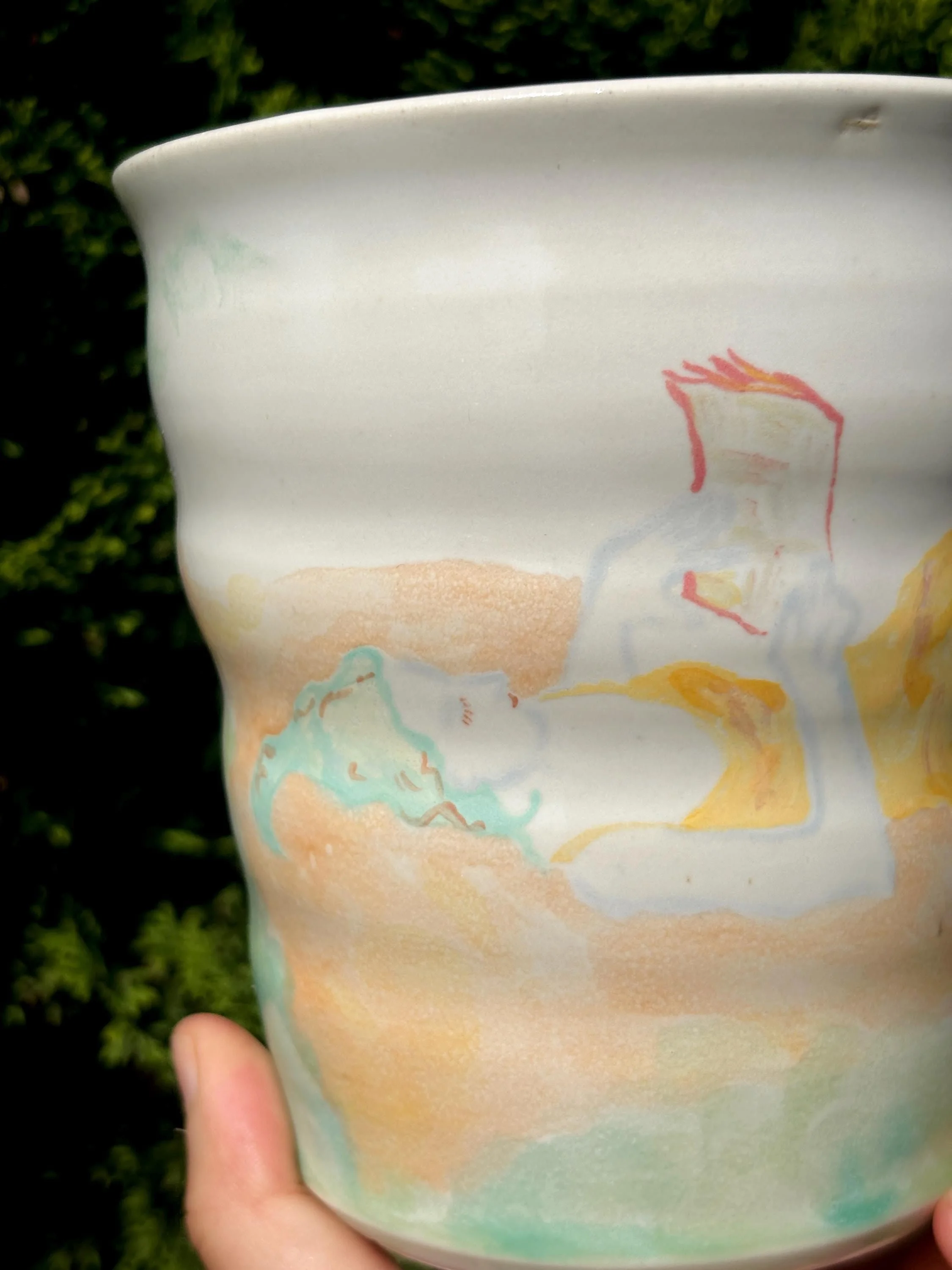 - Wheel thrown and handpainted - Planter has a woman reading a magazine laying on a picnic blanket with flowing grass all around her - This piece is entirely unique and is a 1 of 1 - Food-safe, Dishwasher-safe, and Microwave-safe - To see more of my work, visit my etsy store or my website: Hazelirisart.com