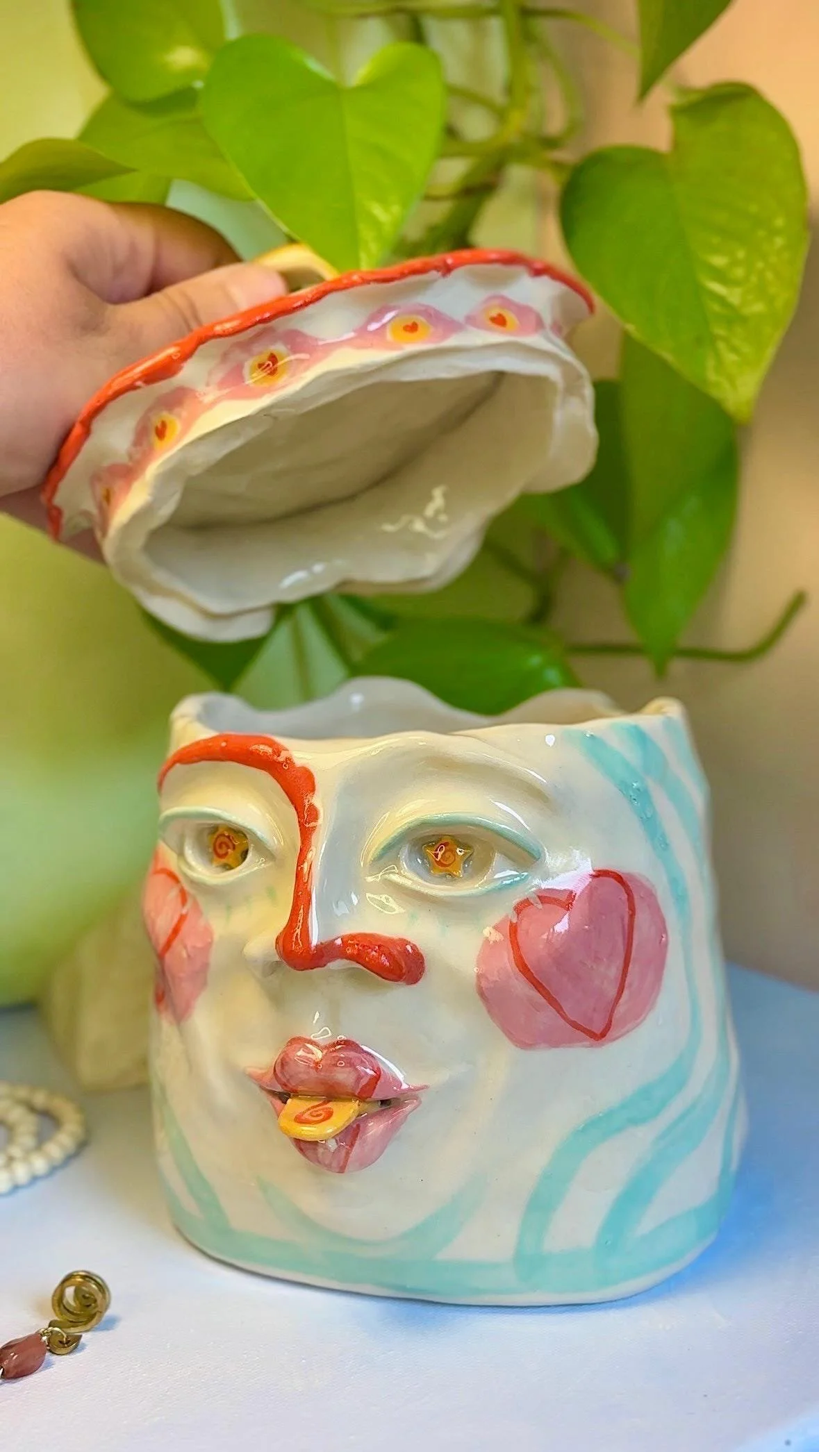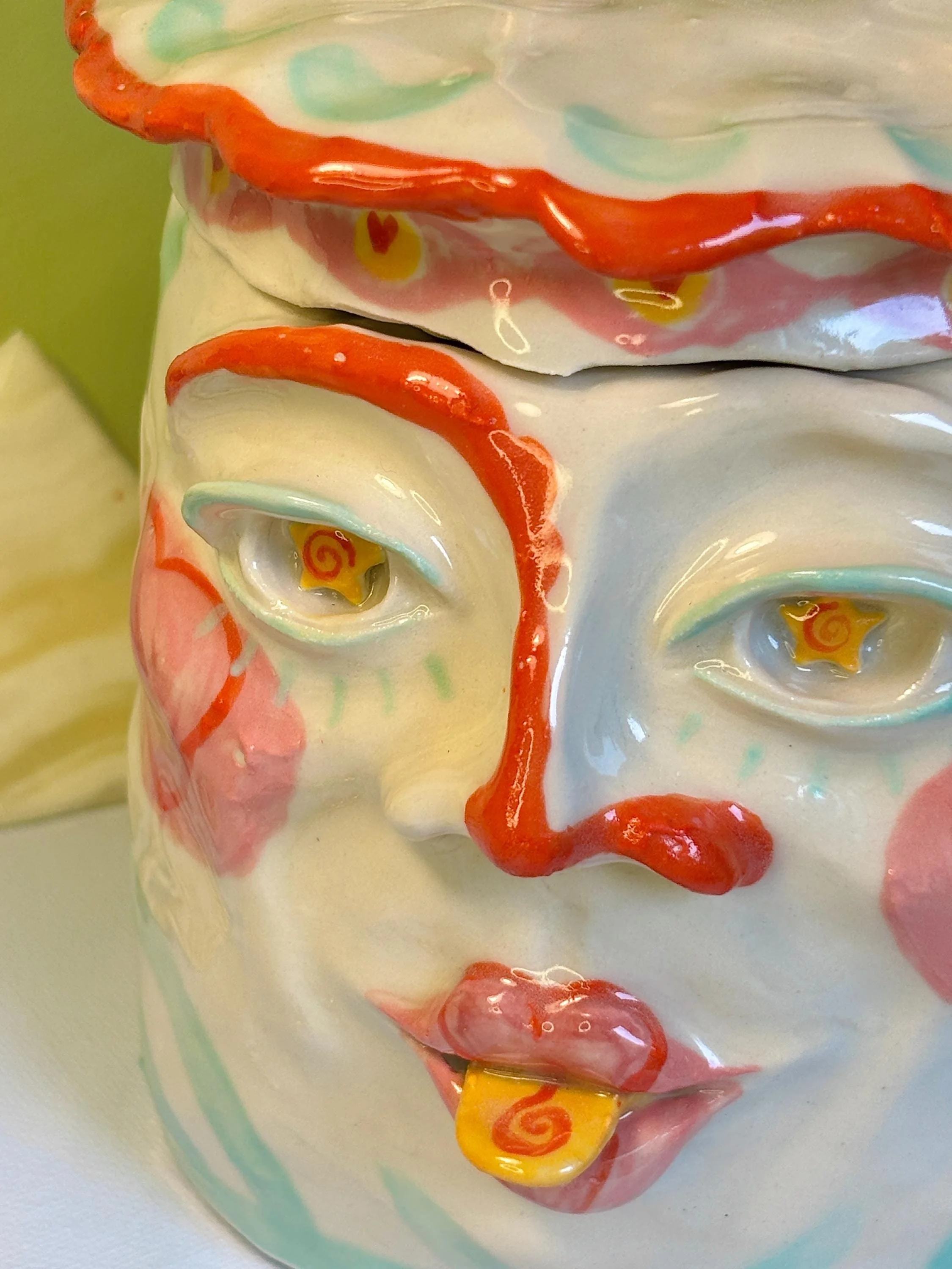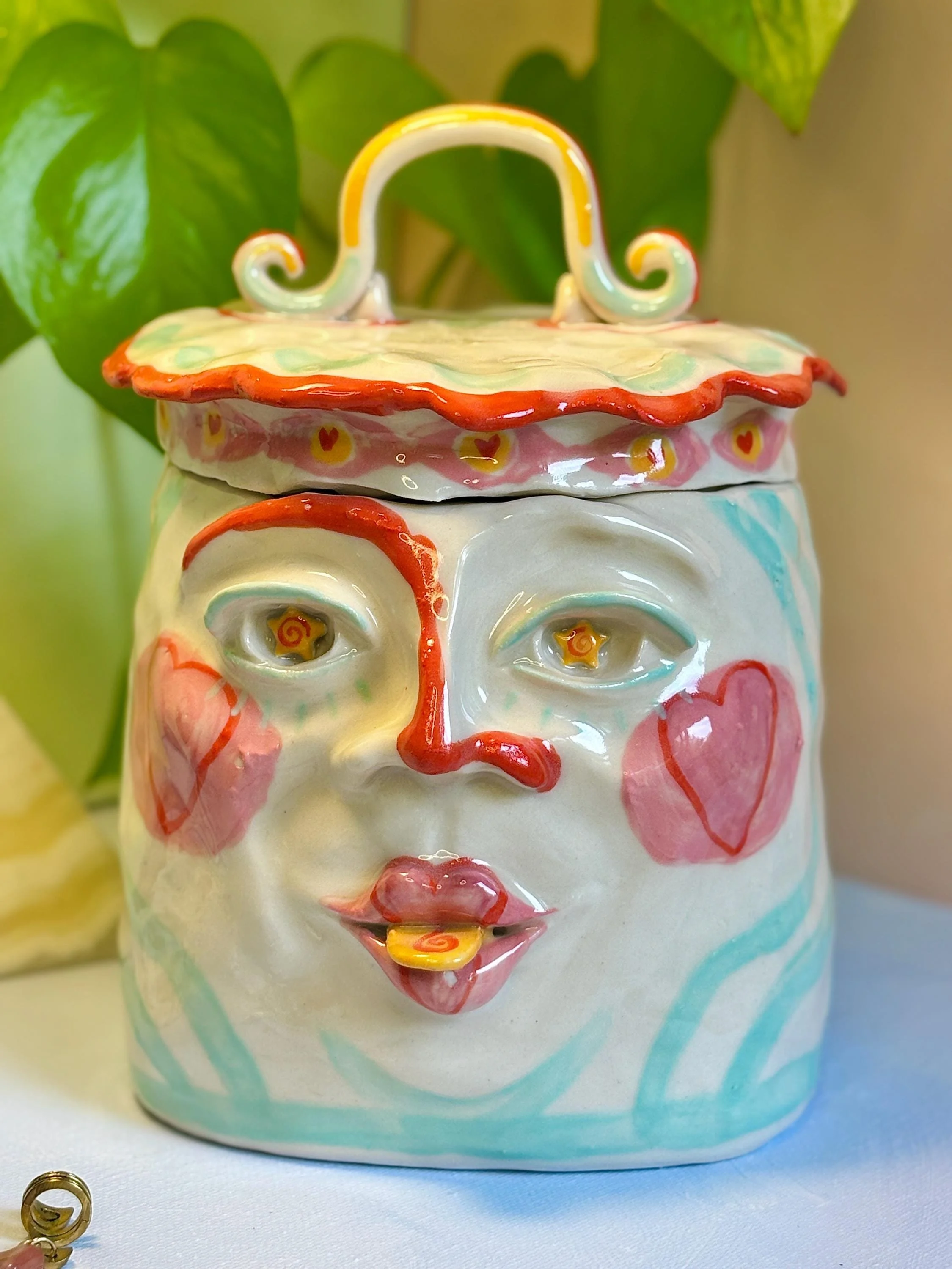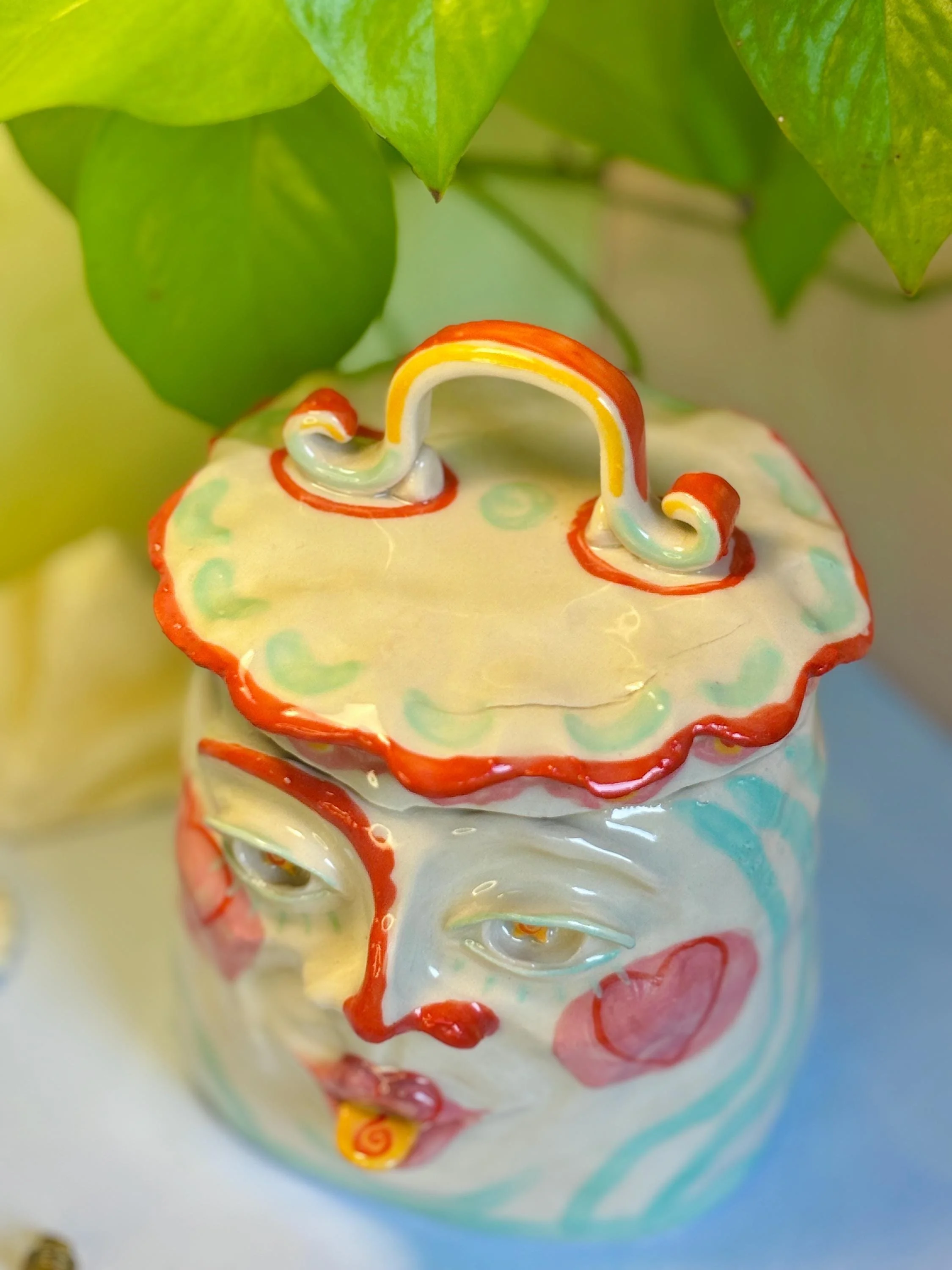 - Hand-made sculpted ceramic jar - Fun colors and silly vibe - There are a couple cracks and spots where the underglaze peeled off and the price reflects this. - This piece is entirely unique and is a 1 of 1! - Food-safe, Dishwasher-safe, and Microwave-safe - To see more of my work, visit my Etsy store or my website: Hazelirisart.com