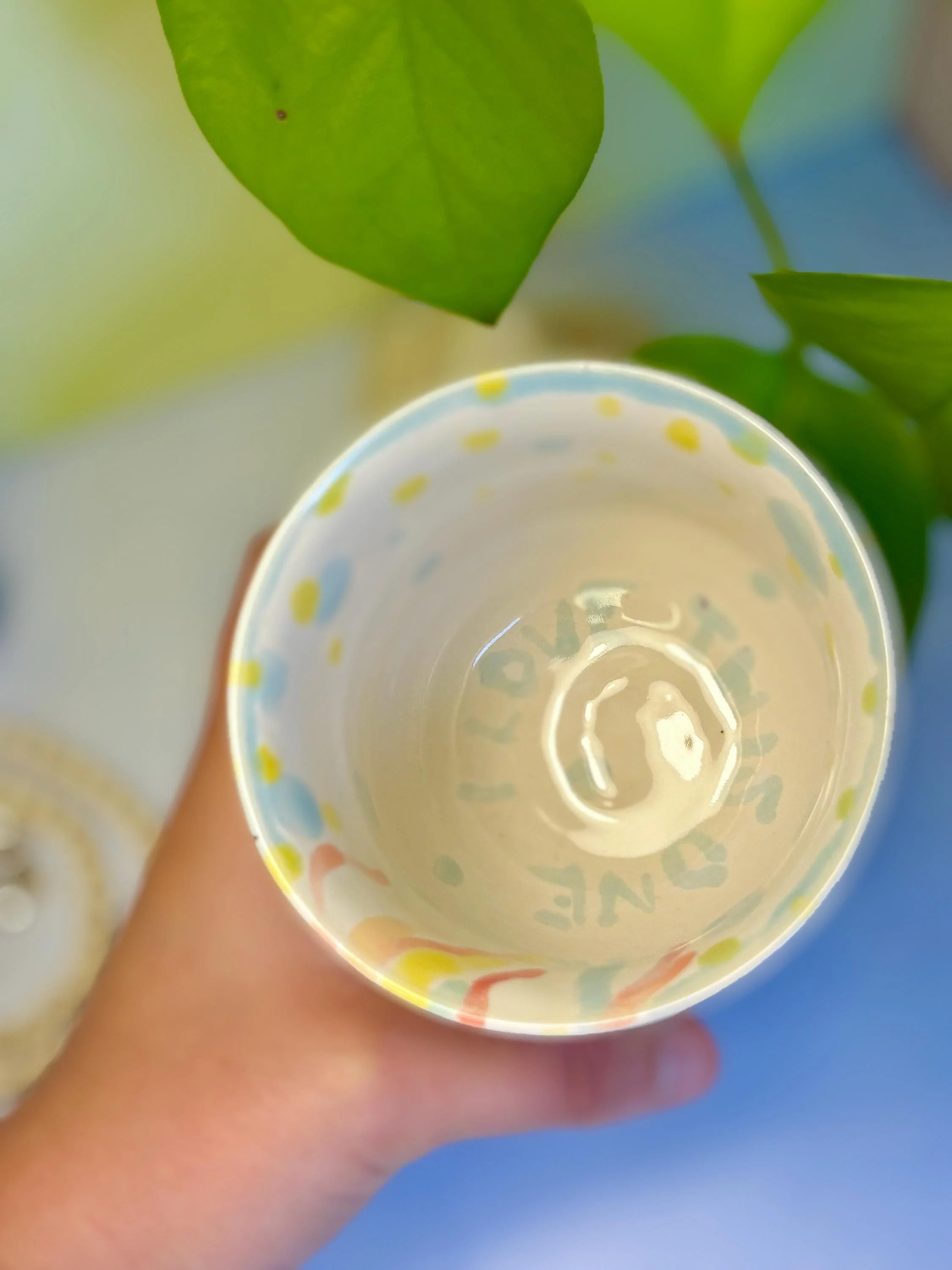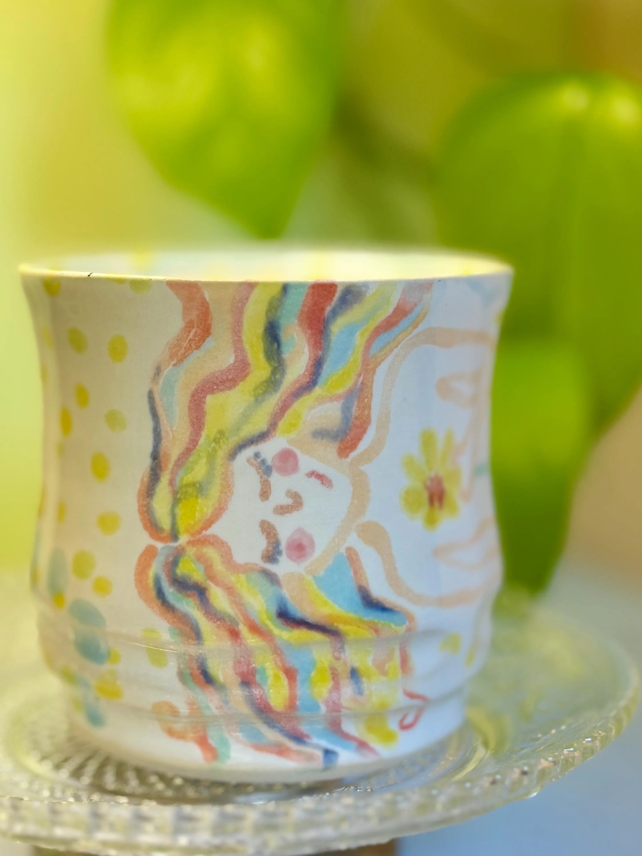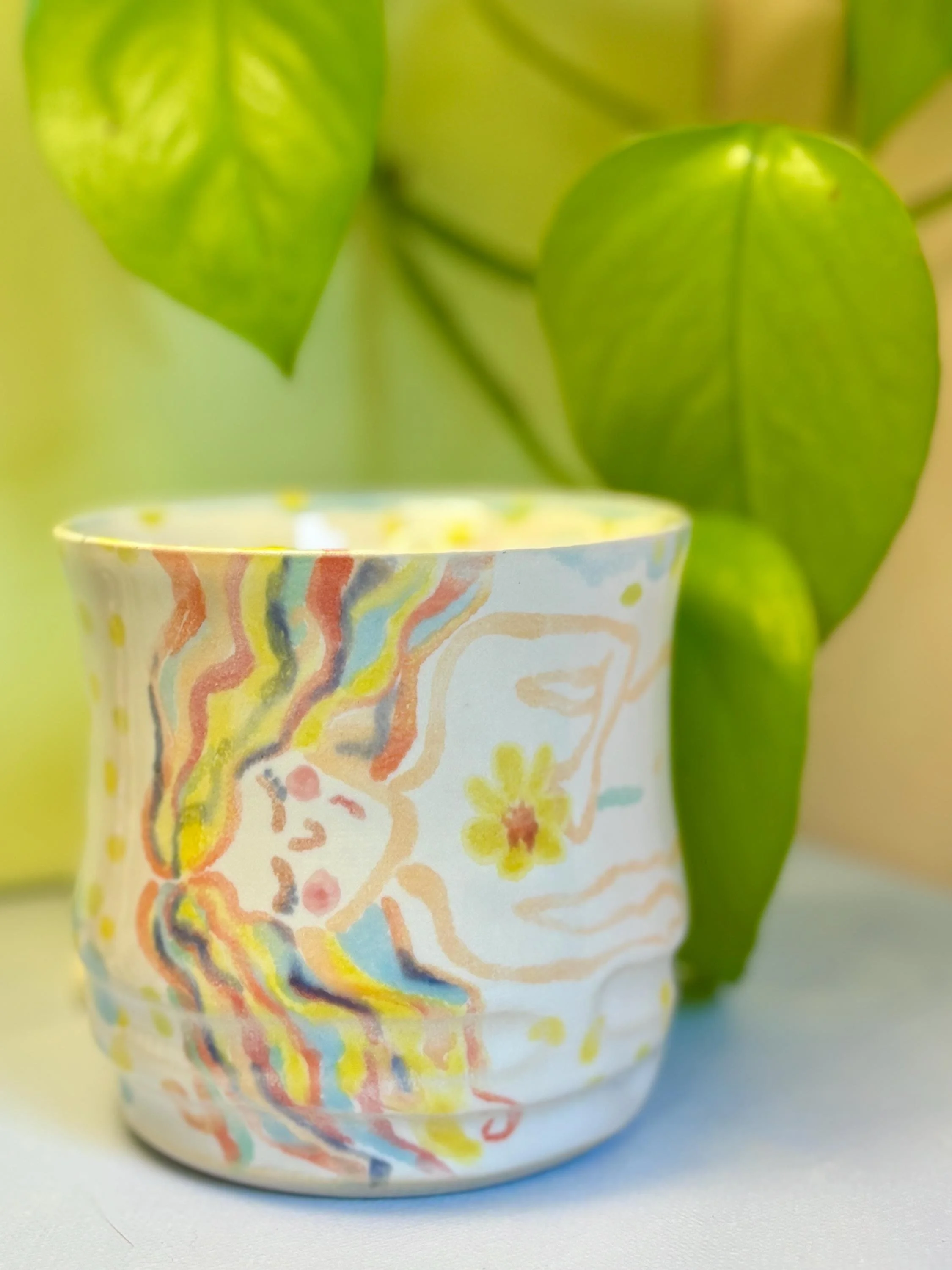 - Wheel thrown and hand-painted ceramic cup - Food-safe, Dishwasher-safe, and Microwave-safe - The outside is a hand-painted woman with fruity-pebble-esque hair and she is holding a flower - The inside expresses her thoughts: "I love this one" - To see more of my work, visit my etsy store or my website: Hazelirisart.com