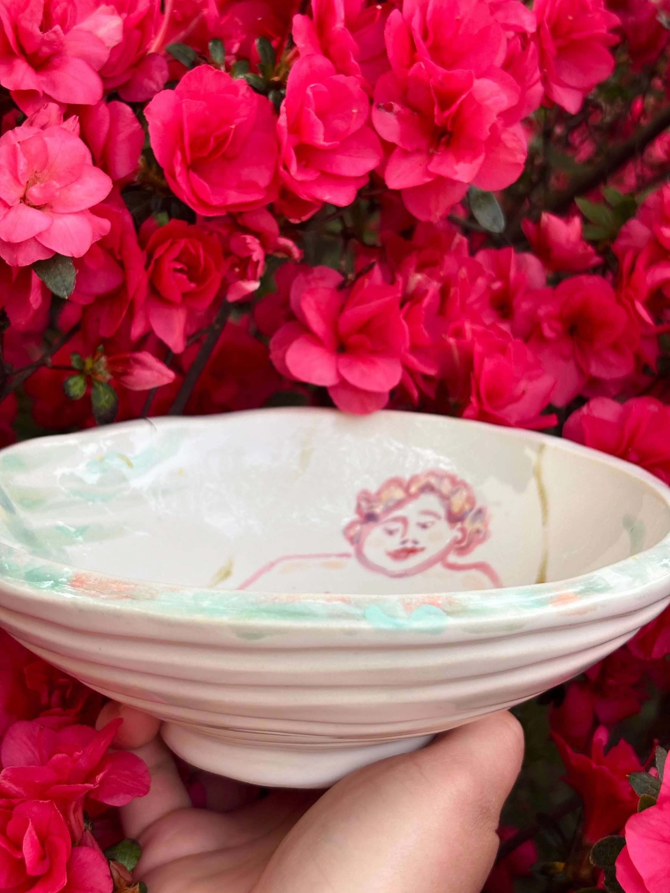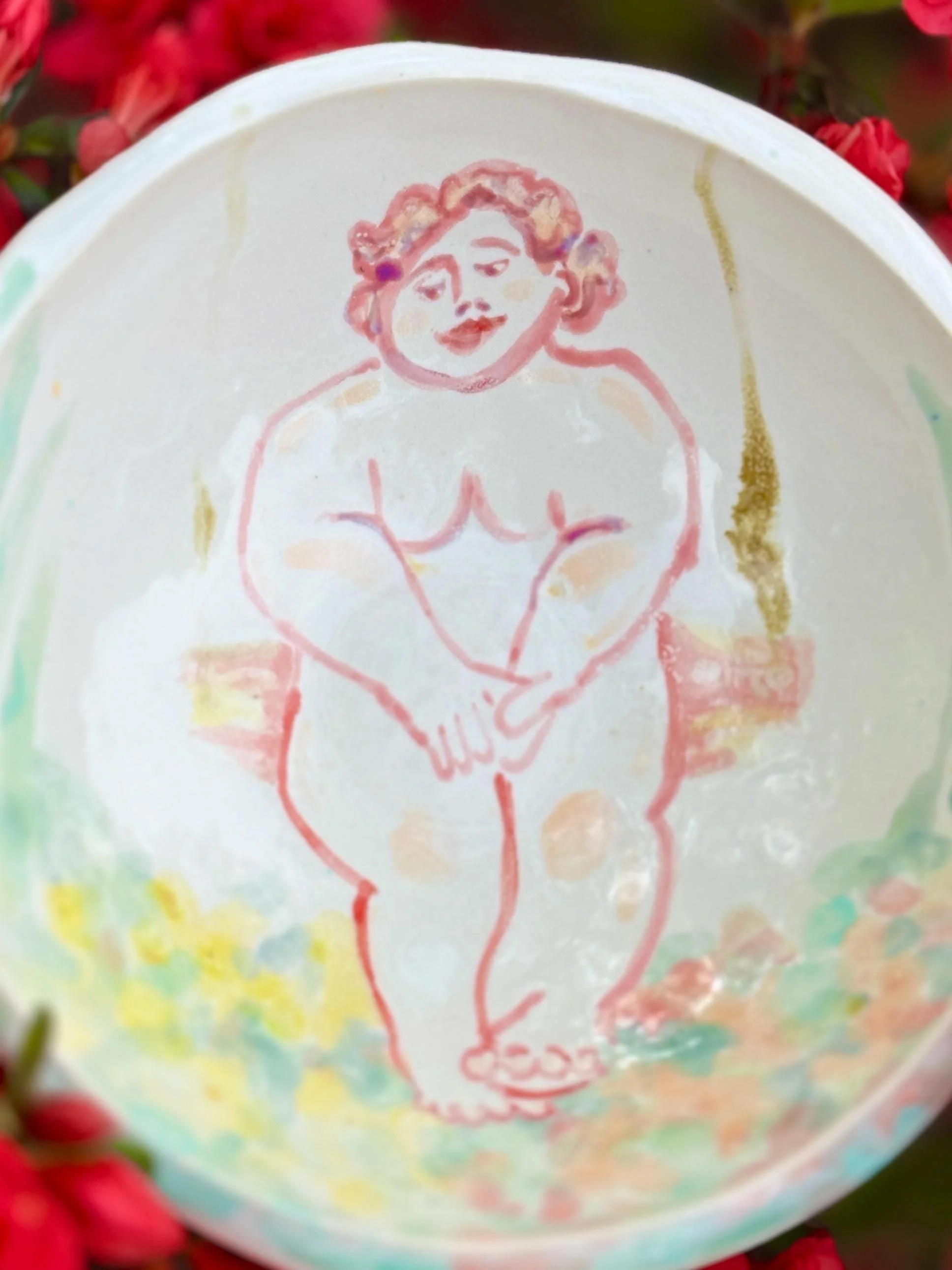 - Hand built with slab and hand painted - Bowl is perfect sized for a rice bowl dinner, spaghetti, etc. - On it is painted a woman enjoying her garden on a swing - This piece is entirely unique and is a 1 of 1 - Food-safe, Dishwasher-safe, and Microwave-safe - To see more of my work, visit my etsy store or my website: Hazelirisart.com