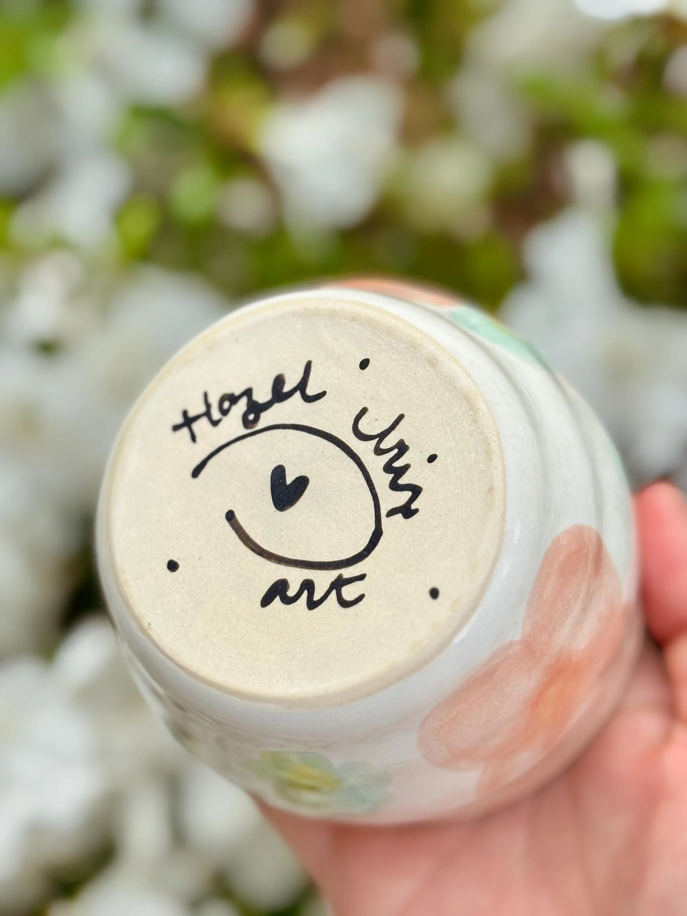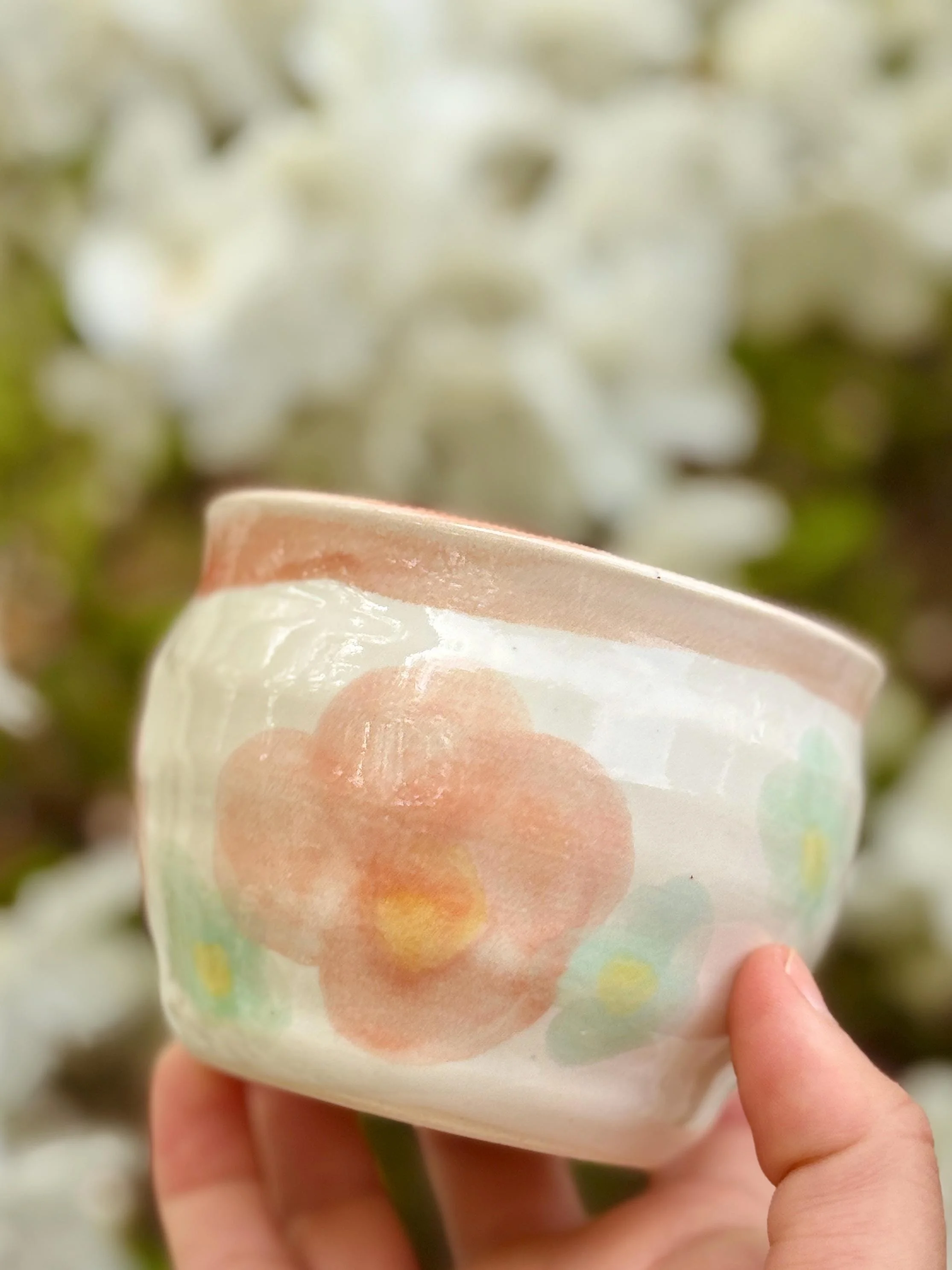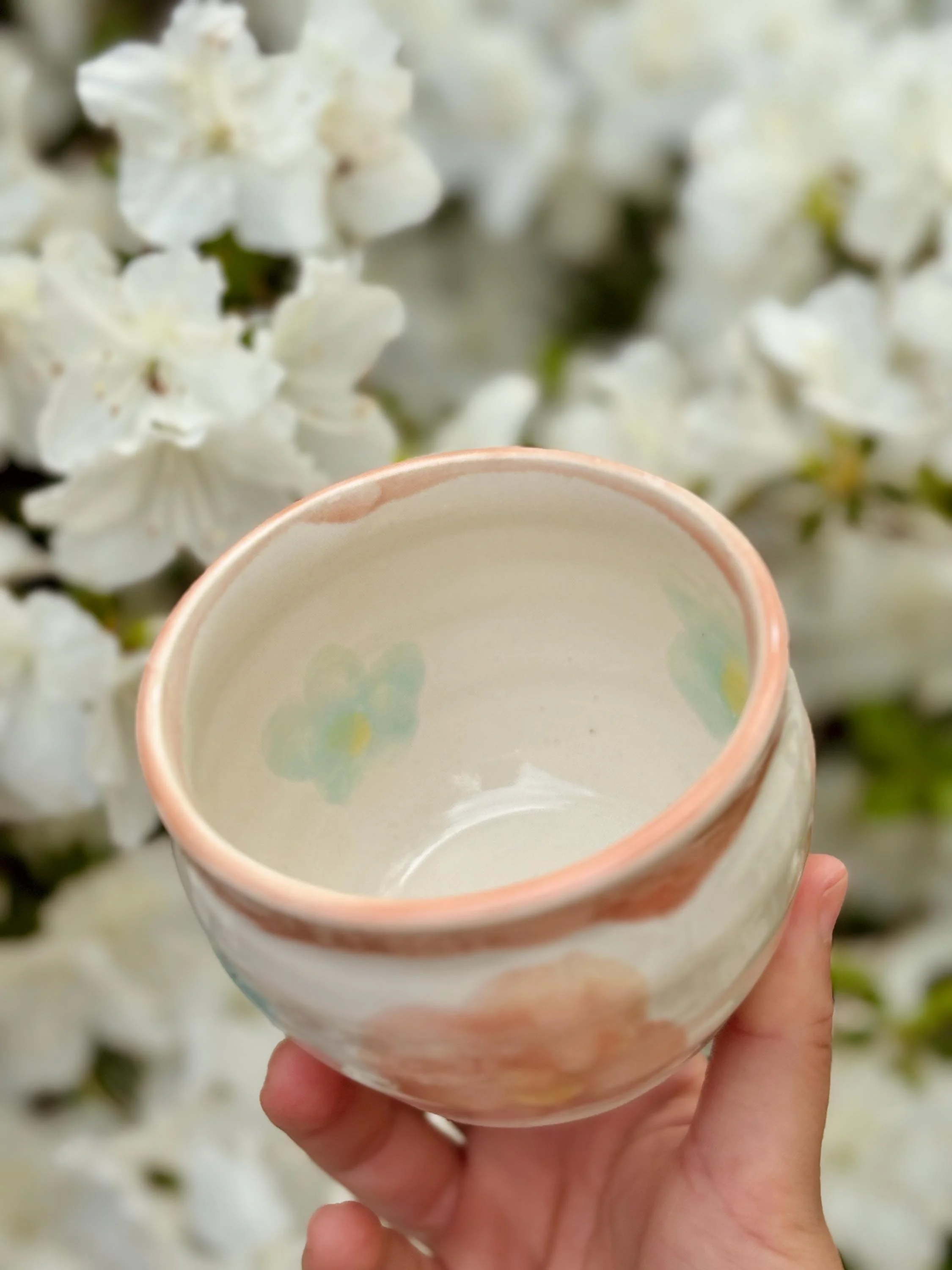 - Wheel thrown vessel with a slight swirl - Small dainty cup with flowers painted on - Food-safe, Dishwasher-safe, and Microwave-safe - To see more of my work, visit my etsy store or my website: Hazelirisart.com