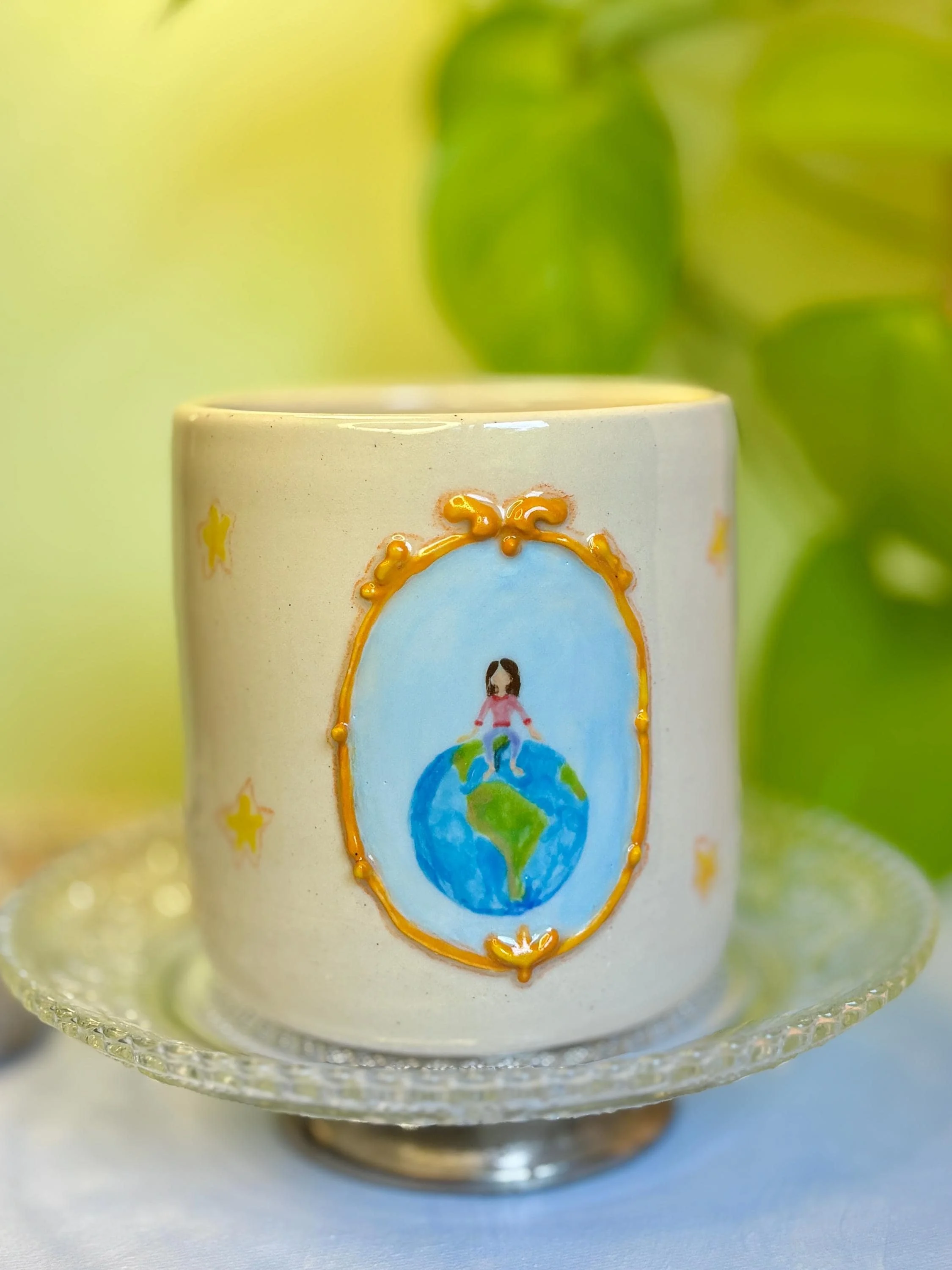 - Wheel thrown and handpainted - Each cup has a lady interacting with earth - Medium sized cups - This piece is entirely unique and is a 1 of 1 - Food-safe, Dishwasher-safe, and Microwave-safe - To see more of my work, visit my etsy store or my website: Hazelirisart.com