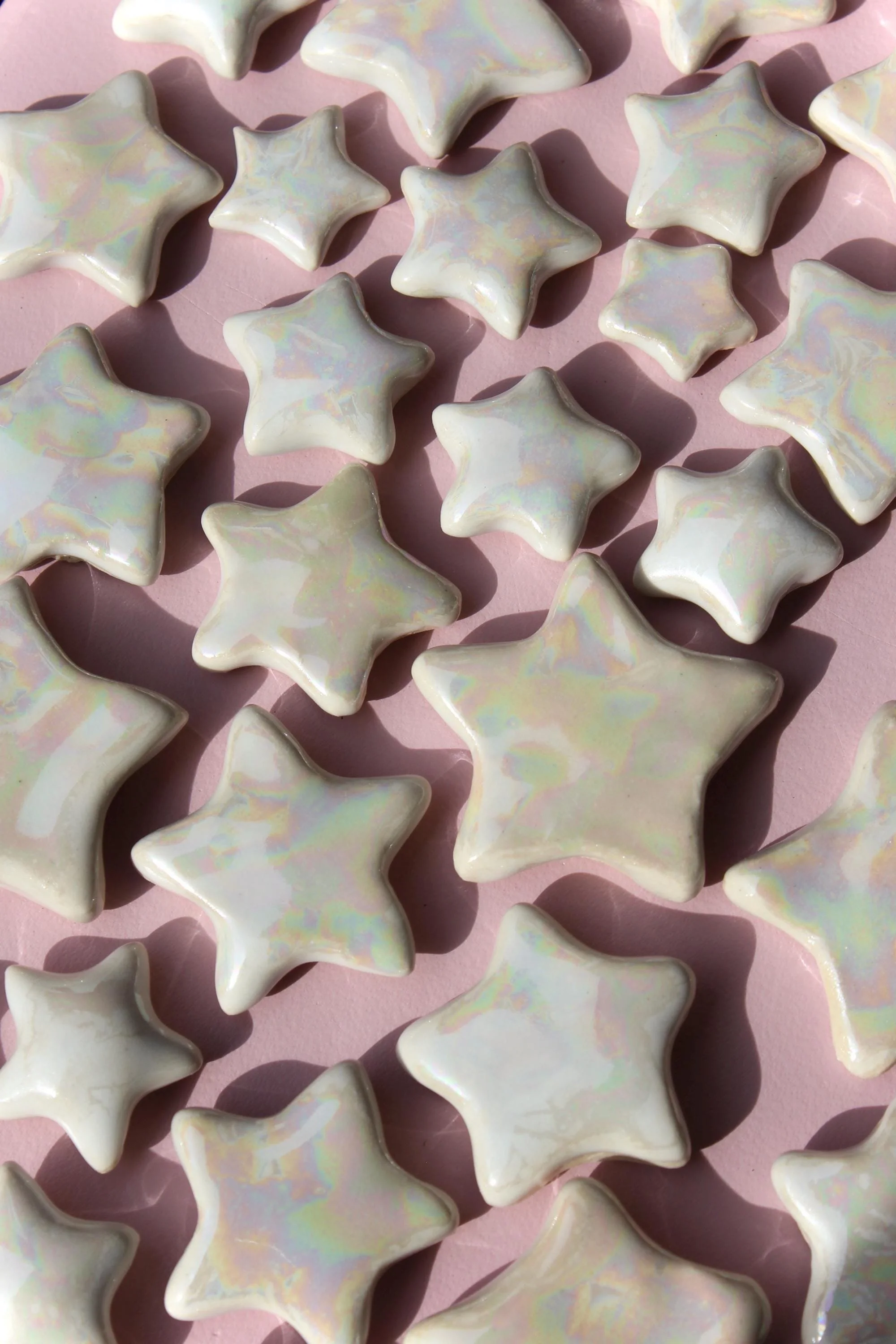 Shop › Set of 3 Opalescent Star Magnets - Hand Sculpted "Fridge Glitter" Image 1 of 6 Image 2 of 6 Image 3 of 6 Image 4 of 6 Image 5 of 6 Image 6 of 6 Set of 3 Opalescent Star Magnets - Hand Sculpted "Fridge Glitter" $15.00 ✨Hand sculpted stars that I affectionately call "Fridge Glitter"✨Perfect for the fridge or any magnetic surface!Each purchase includes one set of 3.Glazed with glossy white and lustered with an opalescent finish. Each is fired in a kiln 3 times.Strong magnet epoxied to the back of each. Please note each one is of slightly varied size. Add To Cart Added! ✨Hand sculpted stars that I affectionately call "Fridge Glitter"✨Perfect for the fridge or any magnetic surface!Each purchase includes one set of 3.Glazed with glossy white and lustered with an opalescent finish. Each is fired in a kiln 3 times.Strong magnet epoxied to the back of each. Please note each one is of slightly varied size.