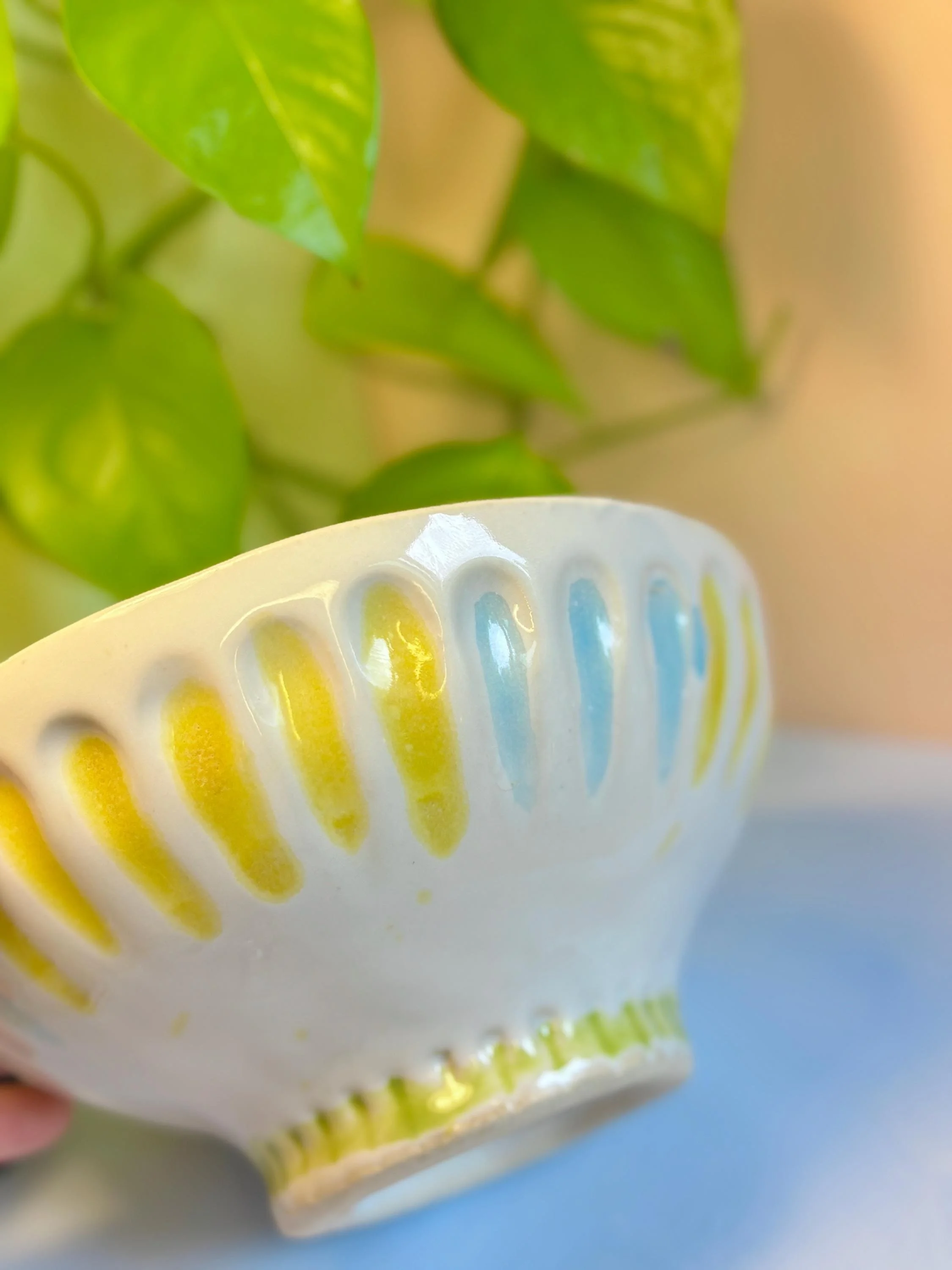 - Handmade large bowl - Sun painted with blue, yellow and green accents - Food-safe, Dishwasher-safe, and Microwave-safe - To see more of my work, visit my etsy store or my website: Hazelirisart.com